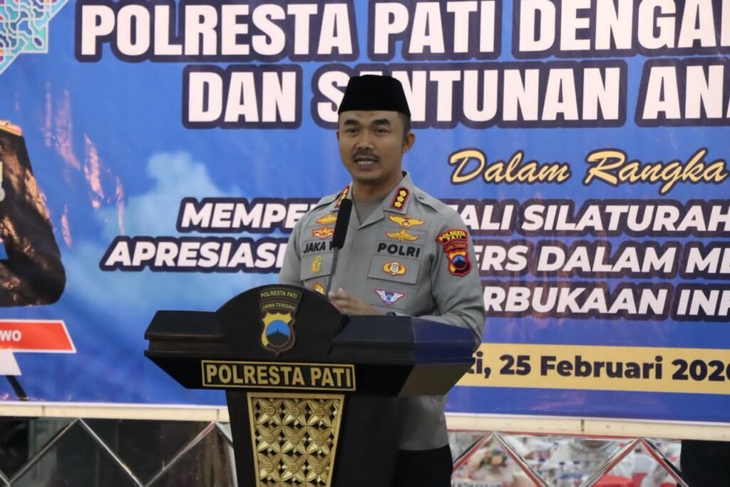 PATI | KometNews.id – Suasana hangat dan penuh kekeluargaan terasa di Aula Sarja Arya Racana, Rabu (25/2/2026) sore. Polresta Pati menggelar buka puasa bersama insan pers sekaligus santunan anak yatim sebagai bentuk penguatan sinergitas antara kepolisian dan media.