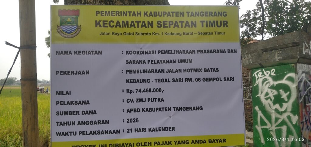 Pemerintah Kabupaten Tangerang melalui Kecamatan Sepatan Timur resmi melaksanakan kegiatan pemeliharaan jalan hotmix batas Kedaung – Tegal Sari, tepatnya di wilayah RW 06 Gempol Sari. Proyek tersebut merupakan bagian dari koordinasi pemeliharaan prasarana dan sarana pelayanan umum tahun anggaran 2026.