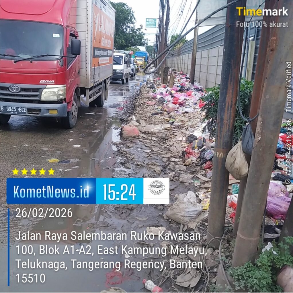 Teluk Naga | KometNews.id – Tumpukan sampah liar terlihat menggunung di sepanjang Jalan Raya Salembaran, tepatnya di kawasan Ruko Puri Naga, Blok A1–A2, Kampung Melayu Timur, Kecamatan Teluknaga, Kabupaten Tangerang, Banten, Kamis (26/02/2026) sekitar pukul 15.27 WIB.