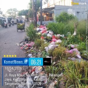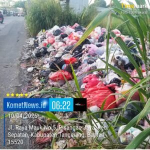 Pantauan Kometnews.id pada Jumat (10/4/2026) pagi, sekitar pukul 06.22 WIB, di Jalan Raya Mauk Km 13, Kecamatan Sepatan, terlihat sampah rumah tangga menggunung di pinggir jalan. Plastik berbagai warna, limbah domestik, hingga sisa material lainnya menumpuk tanpa penanganan yang memadai.